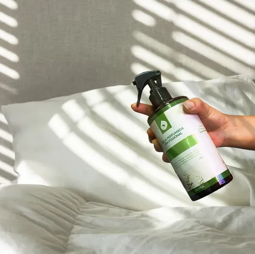 Outro diferencial da água perfumada para ambientes da Olyra é sua composição especialmente elaborada para não manchar tecidos.